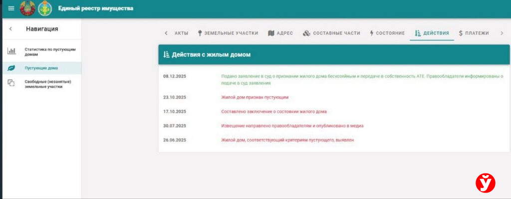 Если в течение трёх лет в доме никто не появлялся, сельисполком вправе обратиться в суд, чтобы жильё признали пустующим. Следующий шаг при положительном решении — дом признаётся бесхозяйным и передается сельисполкому. Последний вправе его снести либо выставить на продажу. Если наследников дома нет вообще, или они отказались вступать в него — судом он может быть признан выморочным наследством. После чего опять-таки будет продан или снесён.