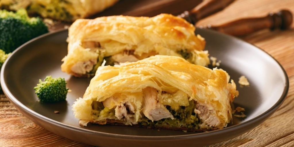 Дрожжевое слоеное тесто здесь выступает не просто основой, а частью конструкции. Начинка из курицы, брокколи и сыра получается сочной, но не теряет структуры благодаря правильной формовке. Такой пирог не стыдно подать гостям, хотя готовится он проще, чем кажется. Главное — соблюсти геометрию: широкие отступы по бокам позволят сформировать ту самую «косичку», которая сделает выпечку нарядной.