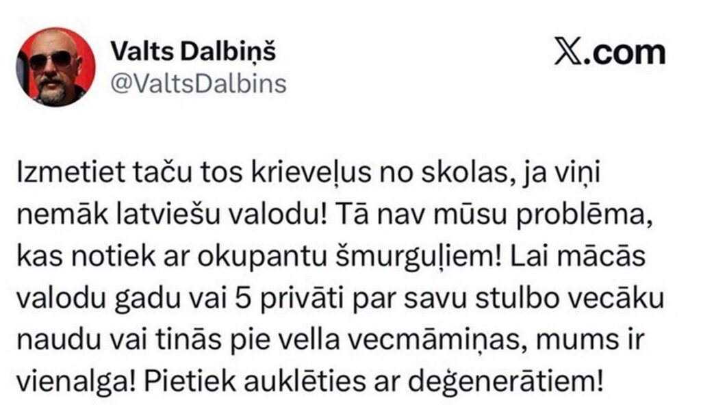 1) Это было сказано в контексте полного перевода русских школ в Латвии с 1 сентября 2025 года на обучение на латышском языке. Учителя-латыши (русских учителей из школ выгнали) вздыхают, что дети плохо усваивают учебный материал на латышском языке. Нет, в бытовом общении они латышским-таки владеют, но слушать сложные школьные предметы на латышском готовы далеко не все. Хуже того, на переменах они между собой общаются ПО-РУССКИ. О, ужас! Вердикт Далбиньша: «Нужно выгнать эту русню из школ».