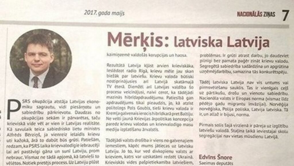 Ну ладно, интернет… Но ненависть к русским звучит и из уст депутатов Сейма. Например, Эдвин Шноре, депутат латвийского Сейма, назвал русских «вшами», которые завелись в «латвийской шубе» и которых необходимо вывести. Не шепотом в кулуарах Сейма, а в газетной статье под заголовком «Цель: латышская Латвия». Скрин прилагается: