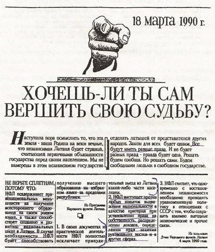 А я помню, я давно живу. Для тех, кто слишком молод, и не застал это «начало», или слишком стар и уже забыл, вот вам таблетка памяти. Это призывная листовка Народного фронта Латвии (НФЛ) от 18 марта 1990 года, когда СССР был еще жив. В Сети сохранился скан: