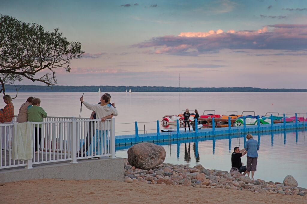 Белоснежный песок, удобные деревянные дорожки, шезлонги, навесы и зонты, а также отдельная VIP-зона на пляже – все это создает атмосферу настоящего морского курорта. Здесь работает ресторан/бар, где гости могут плотно пообедать или просто перекусить. Расположиться можно как внутри, так и на летней террасе с видом на озеро. Особенно приятно проводить теплые вечера под живую музыку по выходным – это придает отдыху по-настоящему курортное звучание.