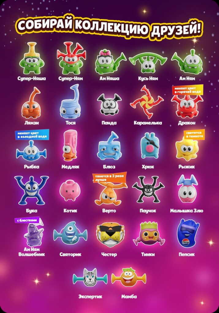 Коллекция «Бонстики и Ам Нямы» состоит из 27 фигурок — персонажей вселенной Ам Няма и друзей Бонстиков. У фигурок есть ручки-липучки: их можно соединять между собой, крепить на карандаши и ручки, украшать комнату или даже новогоднюю ёлку.