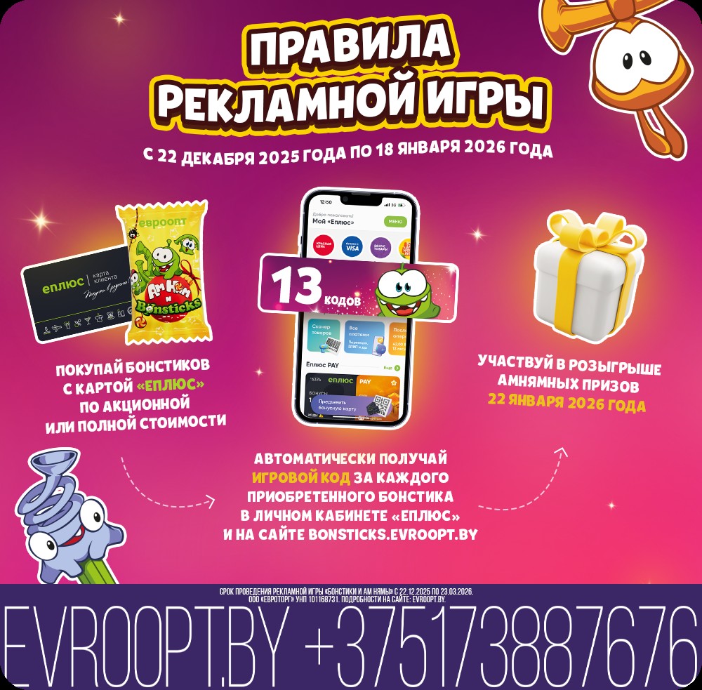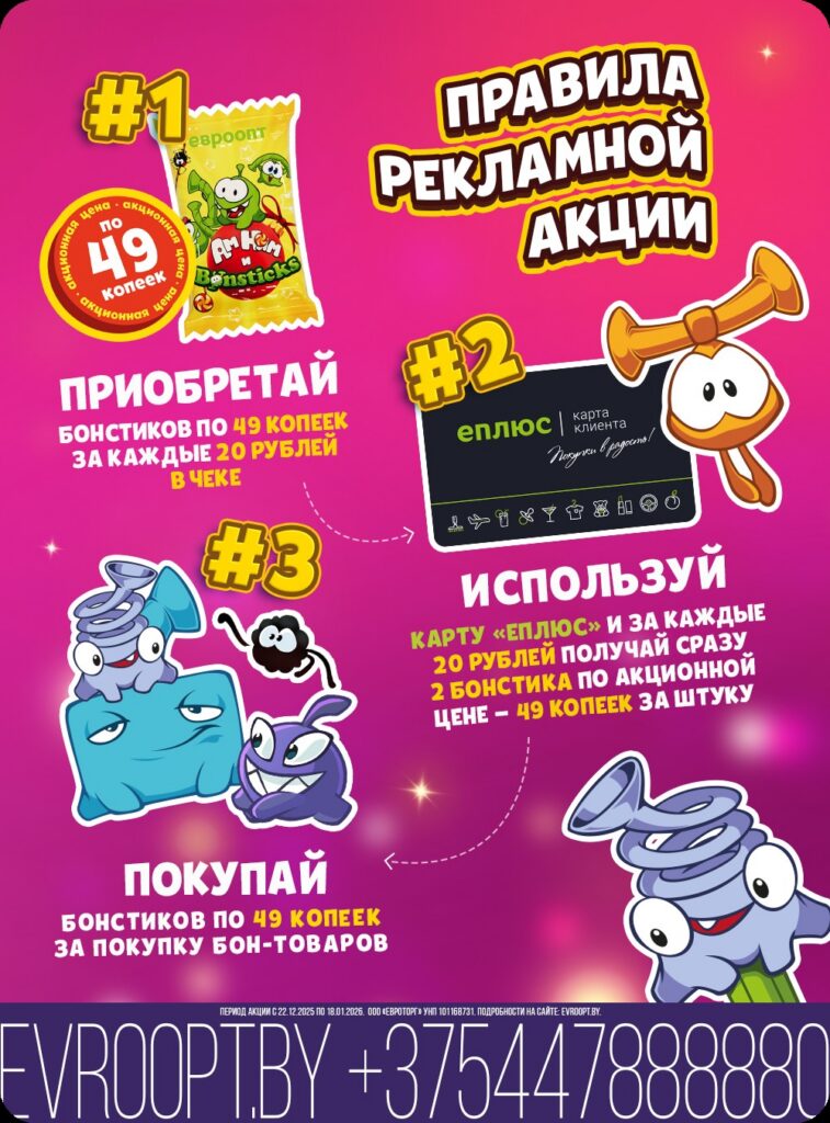 - С 22 декабря 2025 года по 18 января 2026 года покупать Бонстиков с применением бонусной карты «Еплюс» в магазинах «Евроопт» и «Хит!».