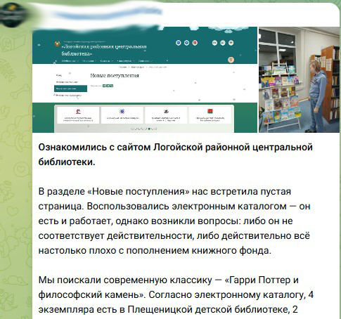 «Мы поискали современную классику — «Гарри Поттер и философский камень». Согласно электронному каталогу, 4 экземпляра есть в Плещеницкой детской библиотеке, 2 экземпляра — в детской библиотеке и 1 — в Завишинской. Вот и всё на целый, динамично развивающийся район», — говорится в подобии инфозаметки.