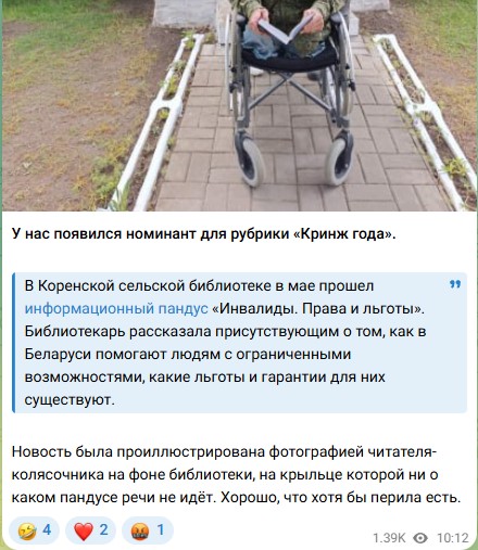 Отсутствие пандуса — это проблема. Но разве можно ее решать подобным образом, мягко говоря, нетактично. Но автору на это плевать. У него нет ни Родины ни земляков, перед которым ему может стать стыдно за подобное. Он за границей и считает, что таким грязным способом, используя под фото инвалида словосочетание «Кринж года», привлекать внимание — это норма. В итоге кринжом года для Логойщины стал этот пост от бчбшников. Сами себе наступили на голову и продолжаете на нее давить — молодцы. Приятно, что по ту сторону границы работают дилетанты, которые не знают какие эмоции у общественности могут вызвать подобные нюансы и подписи под фото.