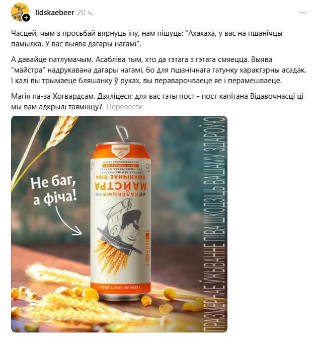 — Давайте объясним. Особенно тем, кто уже смеялся над этим раньше. Изображение «мастера» напечатано вверх ногами, потому что в пшеничном пиве есть осадок. А когда держишь банку в руках — ты её переворачиваешь и перемешиваешь. Магия за пределами Хогвартса, — с иронией написали представители «Лидского пива» в Threads.