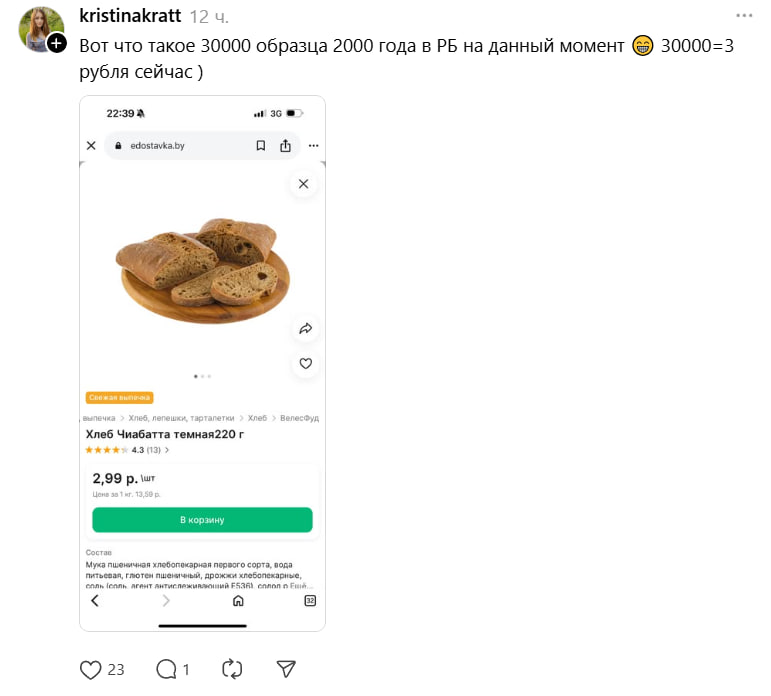 Другая пользовательница наглядно продемонстрировала покупательную способность подарка в прошлом и сейчас, приложив фото буханки хлеба: «Вот что такое 30000 образца 2000 года в РБ на данный момент 😁 30000=3 рубля сейчас».