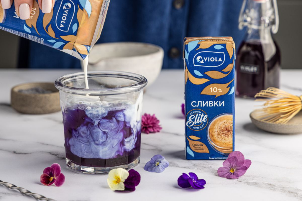 Фиалковый чай с голубой матчей и сливками — это коктейль, который меняет настроение. Секрет здесь не только в цвете самого чая, но и во льде — кубиках с замороженными внутри цветами. Когда лед тает, цветы словно оживают в бокале, делая каждый глоток особенным.