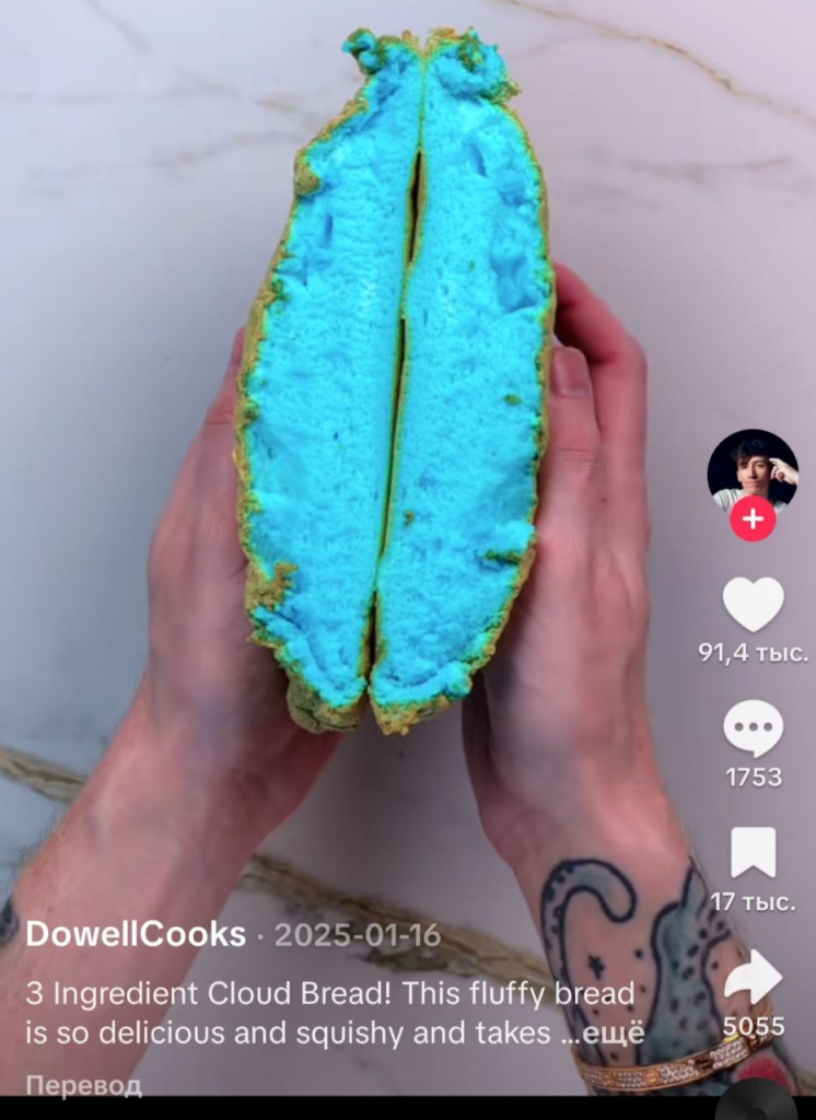Следующий рецепт — настоящий феномен социальных сетей. «Облачный» хлеб, он же cloud bread, завоевал миллионы сердец своей фотогеничностью. В его составе нет муки, а основу составляют взбитые с сахаром белки. По консистенции он напоминает нечто среднее между суфле и безе, а по вкусу — сладковатый омлет.