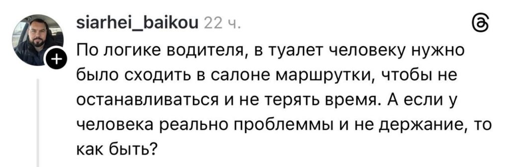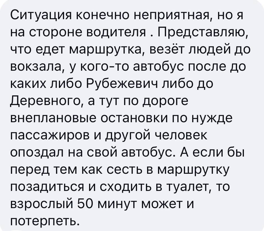 «Ситуация конечно неприятная, но я на стороне водителя. Представляю, что едет маршрутка, везёт людей до вокзала, у кого-то автобус после до каких либо Рубежевич либо до Деревного, а тут по дороге внеплановые остановки по нужде пассажиров и другой человек опоздал на свой автобус. А если бы перед тем как сесть в маршрутку позадиться и сходить в туалет, то взрослый 50 минут может и потерпеть».