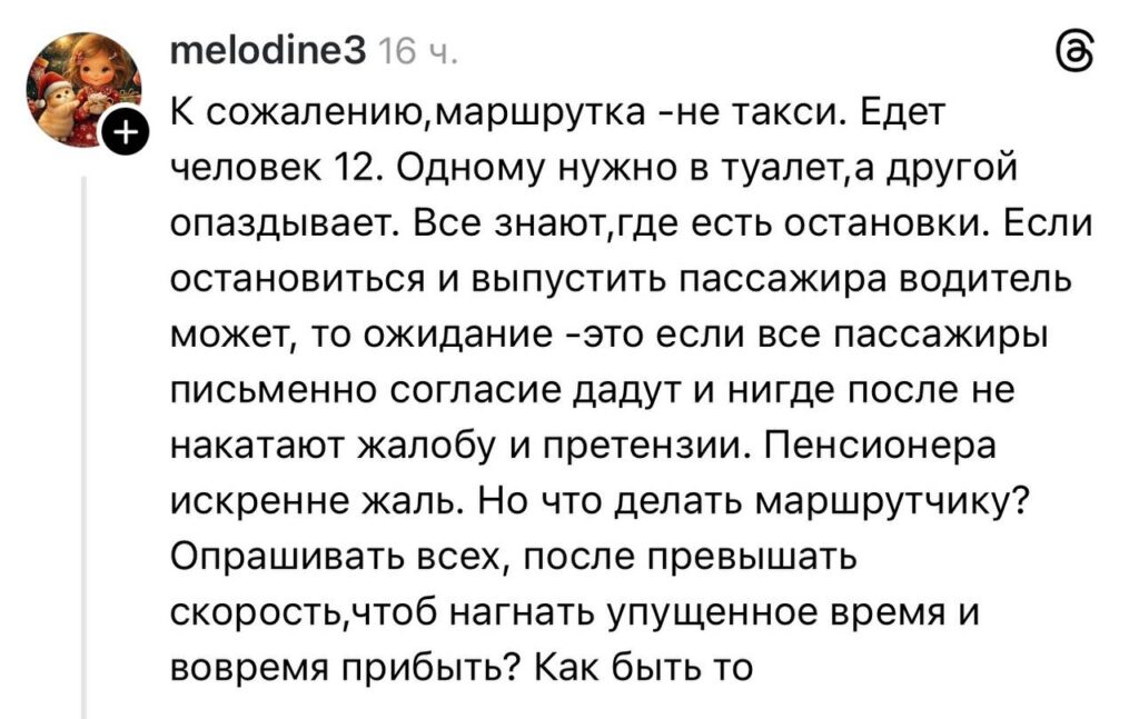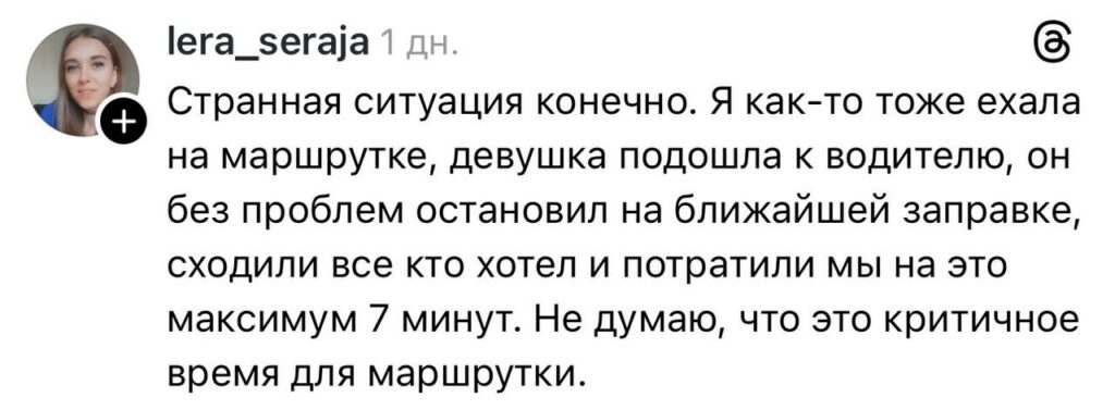 «Папа попросил остановить маршрутку, очень захотел в туалет, — пишет девушка. — Водитель не хотел останавливаться, так как не положено. По итогу остановился, но сказал, что ждать не будет. Так и уехал, оставив папу на трассе.