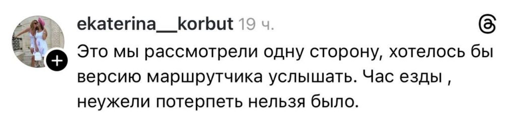«Это мы рассмотрели одну сторону, хотелось бы услышать версию маршрутчика. Час езды, неужели потерпеть нельзя было».