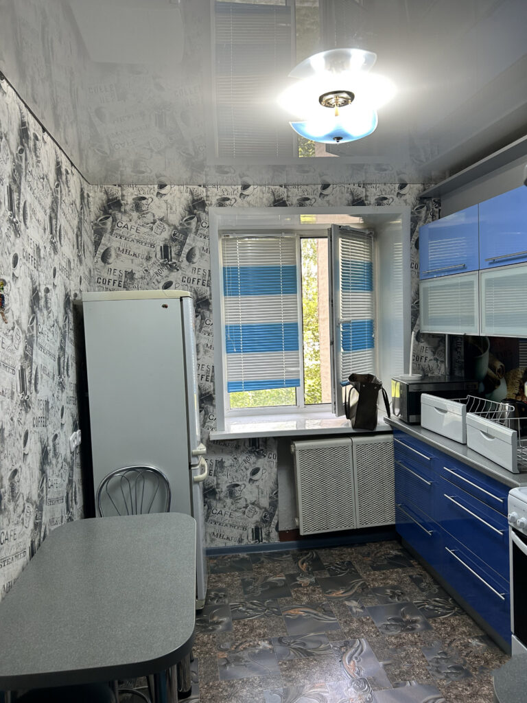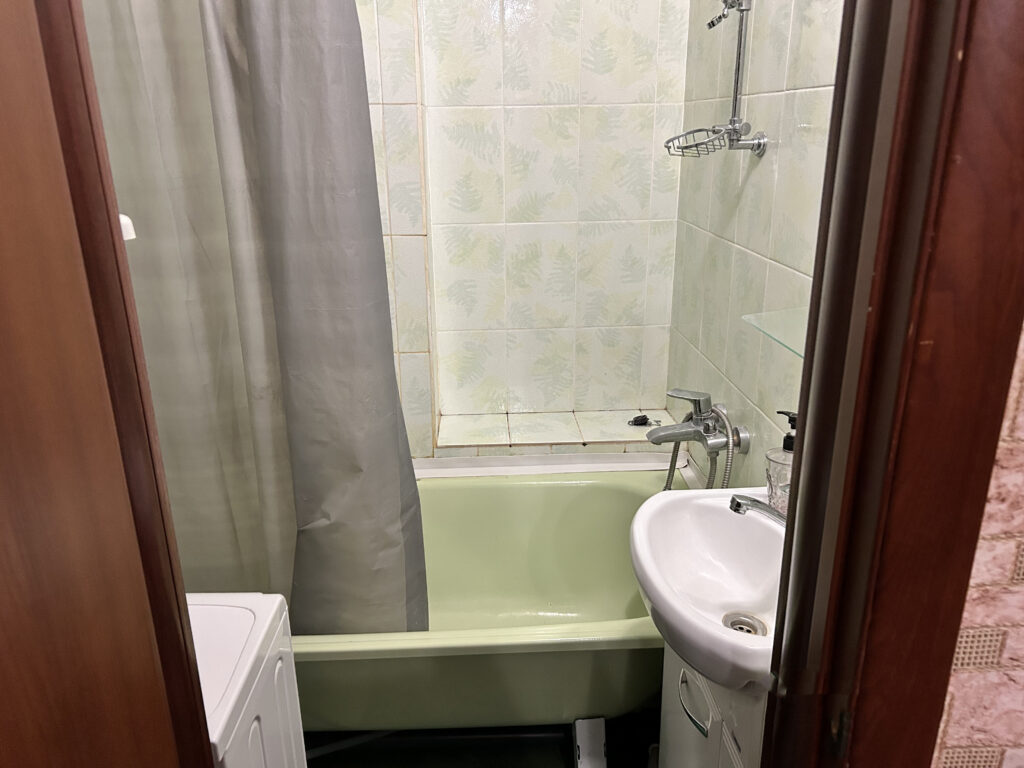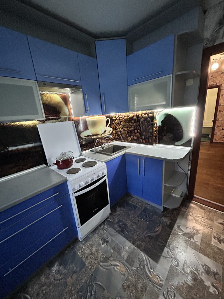 Квартира хоть и небольшая, но очень аккуратная, с ремонтом в приятных сине-голубых тонах. Кухня оборудована всем необходимым, в одной жилой комнате стоит диван, в другой — двуспальная кровать. Санузел раздельный с ванной и стиральной машиной.