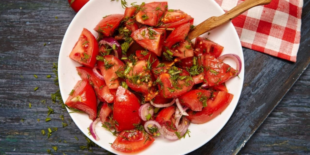 Если первый рецепт — это история про тепло и уют, то этот салат — про характер. Главными ингредиентами здесь выступают не столько помидоры, сколько специи. Приправа заатар, смесь сумаха и кумина превращают простую нарезку из овощей в самостоятельную закуску. Кислинка сумаха и свежесть мяты здесь играют важную роль.