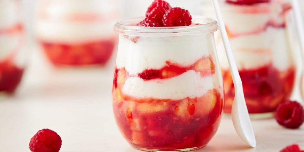 В этом блюде нет муки и масла, но есть эстетика слоев. Персиковый джем, нежный маскарпоне и кисловатая малина создают идеальный баланс сладости и свежести. Это десерт для тех, кто ценит визуальную подачу: прозрачные стаканы позволяют рассмотреть все слои, главным из которых является яркий красный.