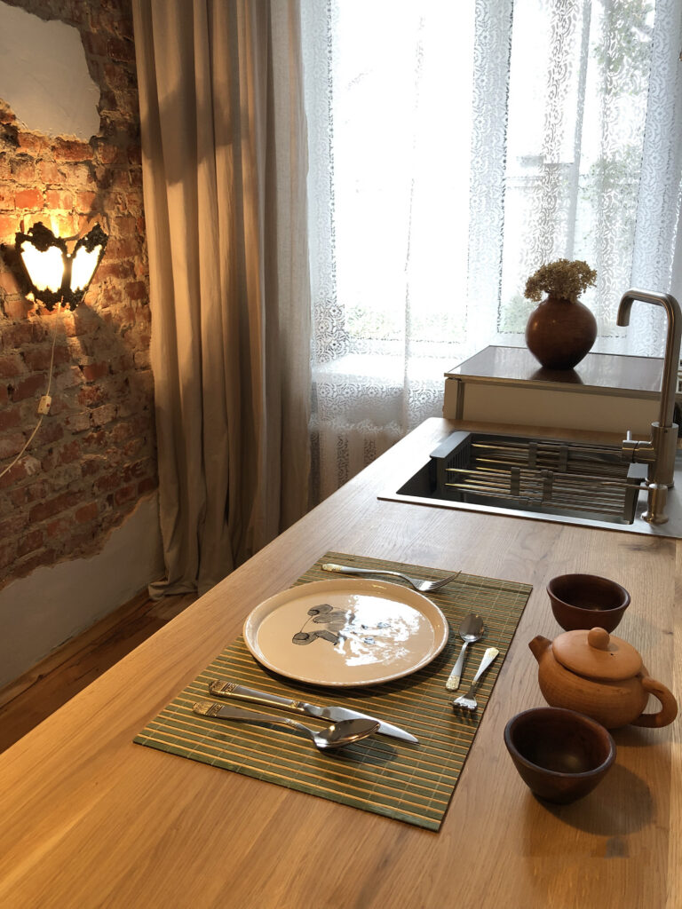 В экодоме, недалеко от частного сектора в Гомеле сдается стильная однушка сталинкого типа. Ключевые особенности этого жилья — высокие потолки, пресущие сталинкам, и нарочито «небрежный» дизайн. Со стен в некоторых местах будто облупилась штукатурка и зазияла кирпичная кладка. Но волноваться арендодателям не стоит — квартира чистая и ухоженная.