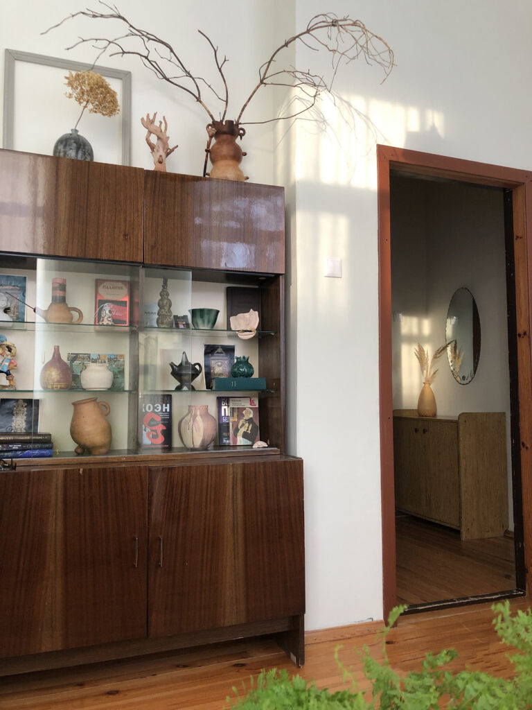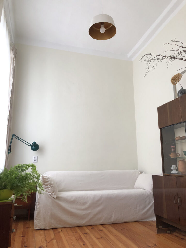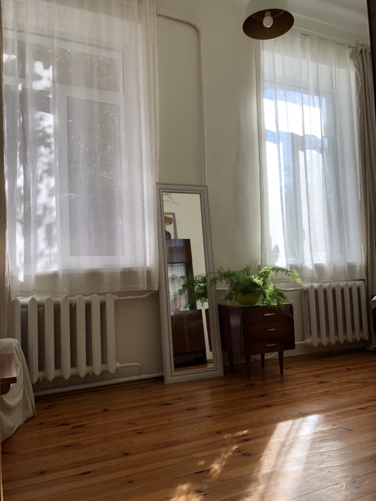 Жилье разделено на единственную жилую комнату и кухню. Комната очень напоминает эстетичное можное пространство из соцсетей — много света и ничего лишнего. Здесь стоит диван, шкаф, кресла и зеркало.
