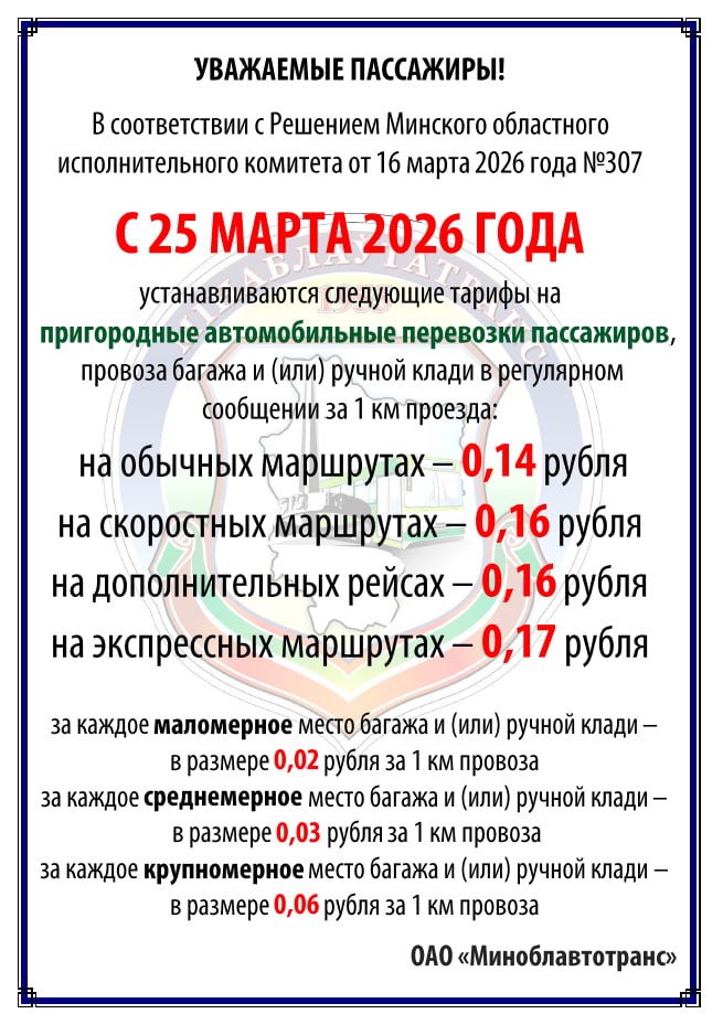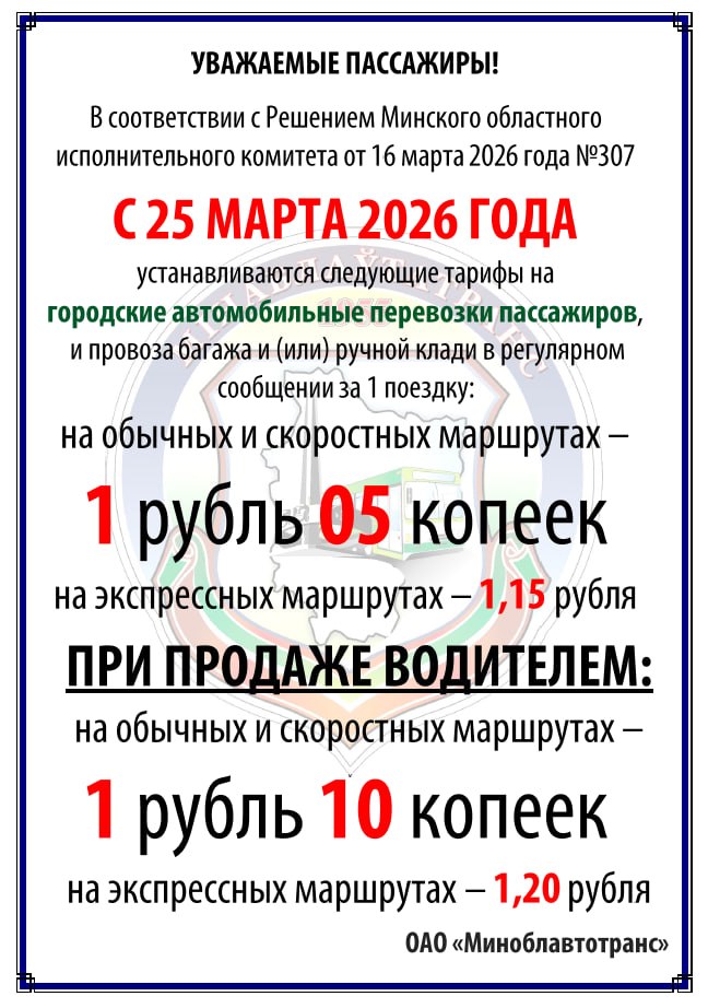 С 25 марта 2026 года в Минской области начинают действовать новые тарифы на городские и пригородные автомобильные перевозки пассажиров в регулярном сообщении.
