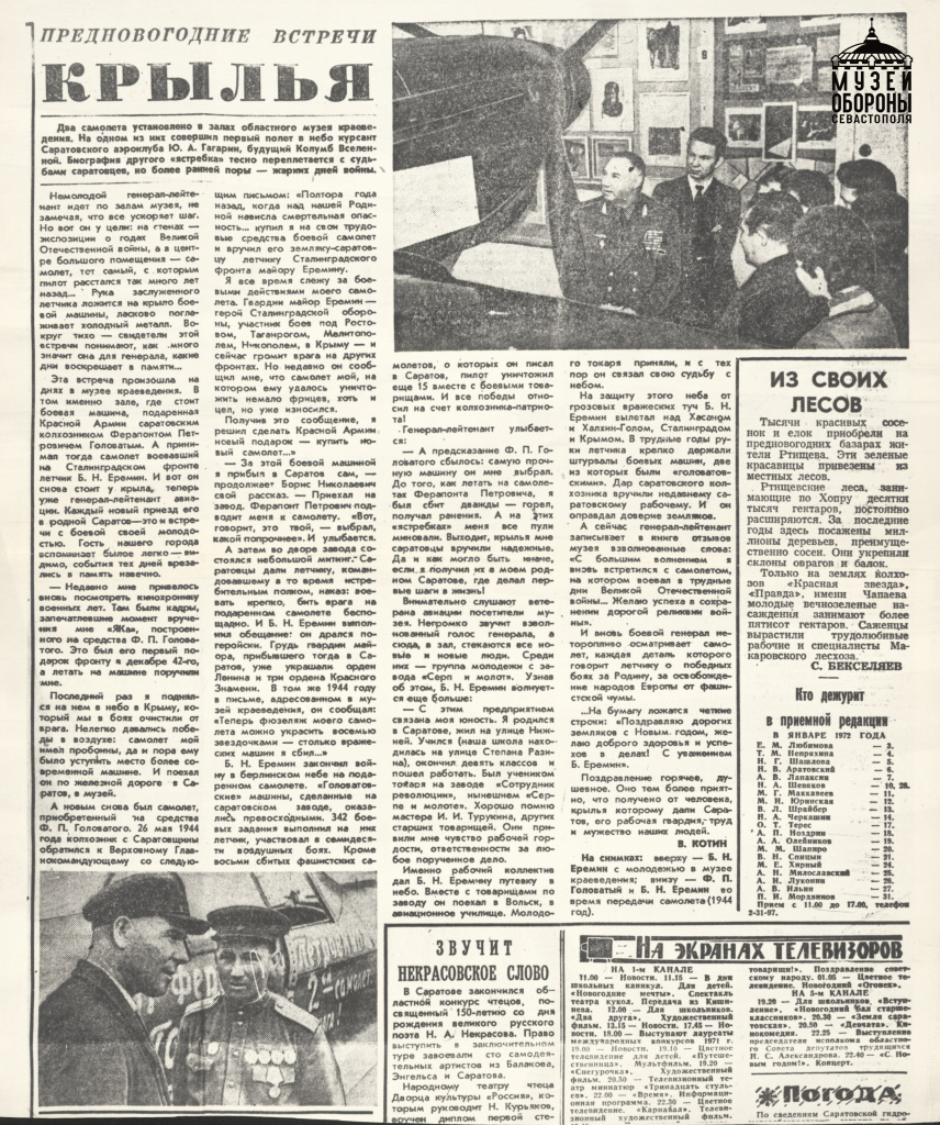 «…Я приехал в полк к подполковнику Борису Ерёмину, чтобы познакомиться с историей его примечательного самолёта. Рассказать это мне будет тем приятней, что самолёт в самом деле примечателен. Это истребитель Як-1 с необычной для боевой машины надписью на фюзеляже: «Лётчику Сталинградского фронта товарищу Ерёмину от колхозника товарища Головатого».