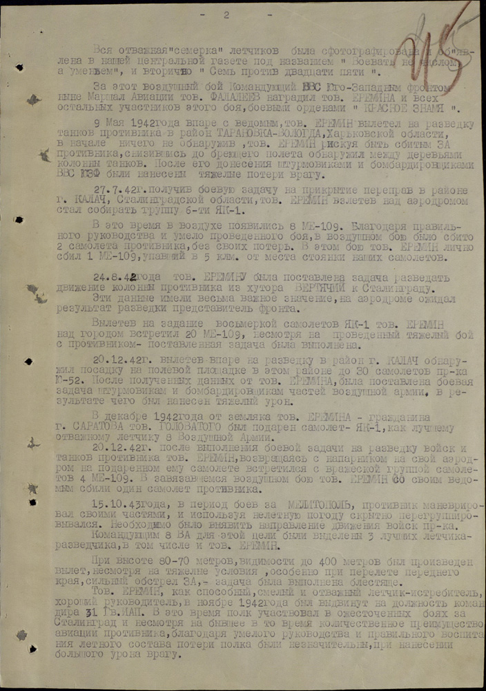 «Летчику Сталинградского фронта гвардии майору Еремину от колхозника колхоза «Стахановец» Головатого».