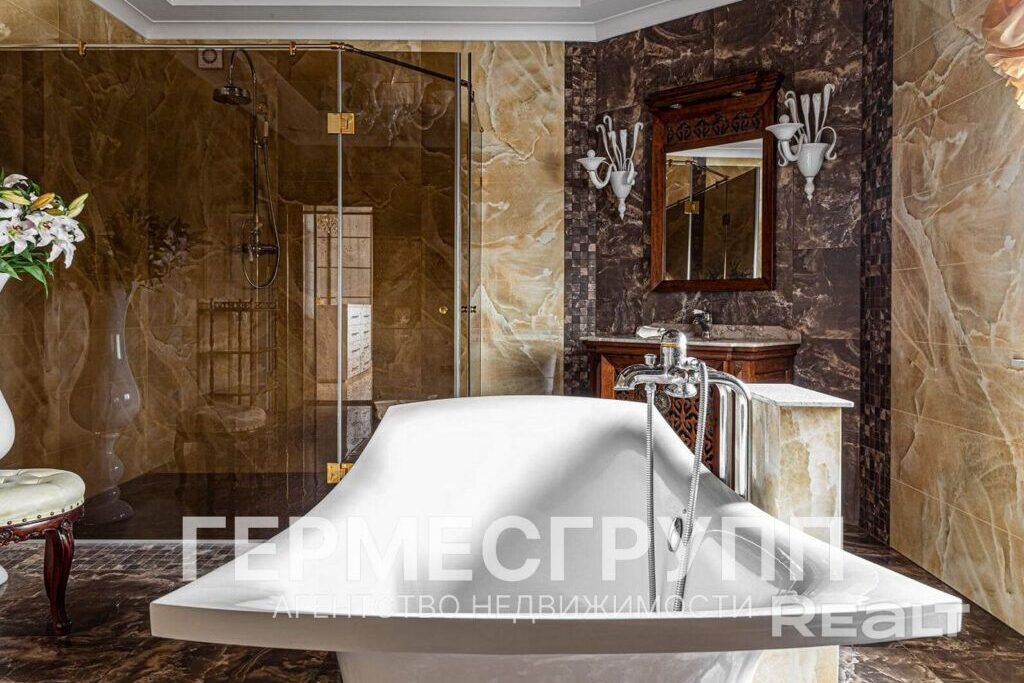 На первом уровне — кухня-гостиная с печью и SPA-комплекс (бассейн, баня). Второй уровень отдан под парадные приемы: просторная гостиная с выходом на террасу 110 м², кинозал, кухня с островом. Третий уровень — мастер-зона: спальня с гардеробной, камином и ванной, плюс две спальни и видовой кабинет. На четвертом — каминный зал, тренажерный зал и обзорная комната с двумя балконами, пишет pristalica.by.