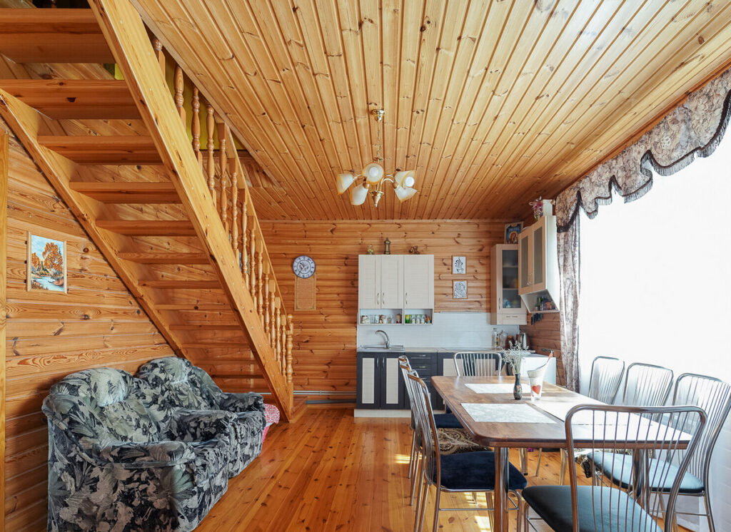 Внутри дома установлены окна из ПВХ, а стены выполнены из дерева (брус, вагонка, имитация бруса), что создает теплую и уютную атмосферу. Крыша покрыта ондулином — гибкой черепицей, что обеспечивает надежную защиту от непогоды.