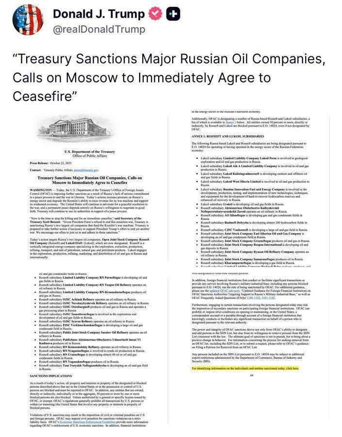 США объявили о введении санкций против крупных нефтяных российских компаний — «Роснефти» и «Лукойла». Об этом сообщили в Министерстве финансов Соединенных Штатов.