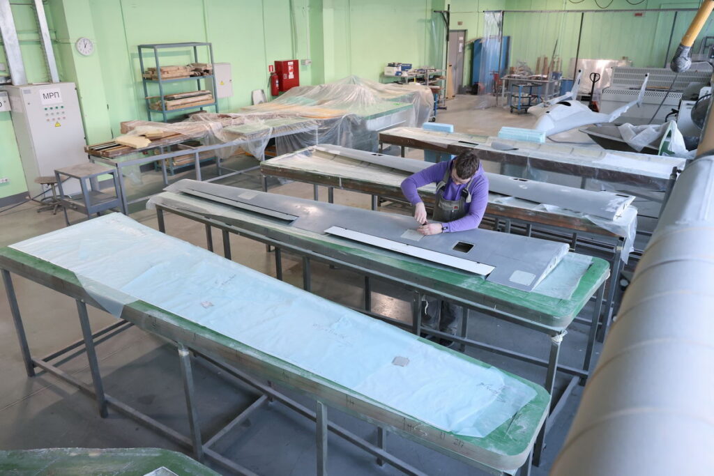 — Именно здесь мы собираем большие самолеты. Отдельные компоненты для БЛА, отдельные узлы, агрегаты и блоки изготавливаются на втором этаже в производственных лабораториях. А здесь, в производственных цехах, изготавливают корпуса летательных аппаратов, как мы называем эти элементы — «корки» самолетов, далее на стапелях отдельные элементы планеров складываются в процессе в беспилотный летательный аппарат, сначала полностью пустой внутри. Потом мы выкатываем их в соседний цех, где начинаются работы по установке двигателя, каналов связи, автопилота, оптики и другого многочисленного оборудования, которое беспилотный летательный аппарат превращает в автономный летающий робот. То есть практически на сто процентов все детали производятся здесь, — поясняет Юрий Яцына.