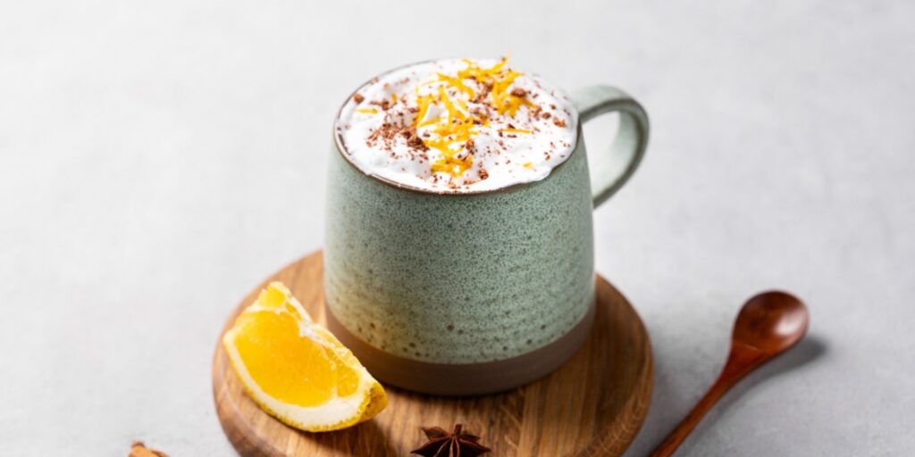 Классическое какао обретает новый характер с добавлением апельсинового сока. Этот дуэт создает гармоничный вкус, а корица усиливает согревающий эффект. Напиток богат антиоксидантами из какао и витаминами из цитруса, что делает его идеальным для пасмурного дня или холодного вечера.