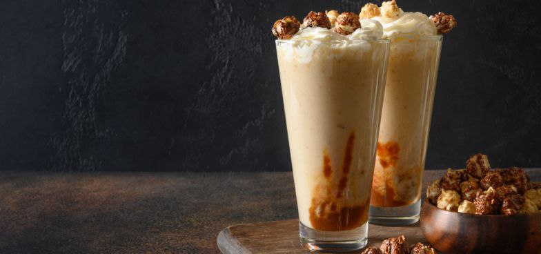 - На внутренние стенки стаканов ложкой наносим карамельные подтеки. Наливаем коктейль. Сверху украшаем шапкой взбитых сливок и горстью соленого попкорна.