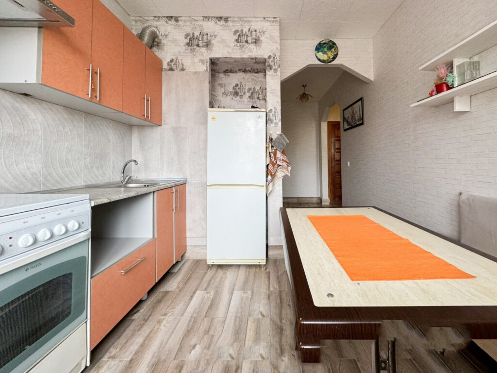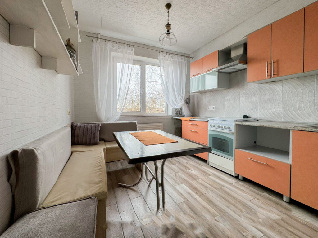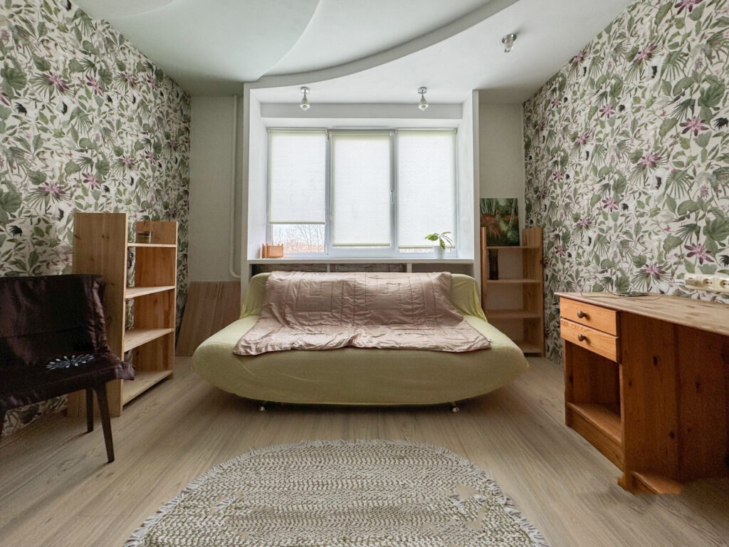 Единственная жилая комната представляет собой вполне просторное светлое пространство, где стоит диван, рабочий стол, шкаф-купе и односпальная кровать. Кроме этого, еще один диван есть в кухне, поэтому временно разместить неожиданного гостя квартира вполне сможет. Кроме этого, имеются необходимые гернитур, холодильник и плита.