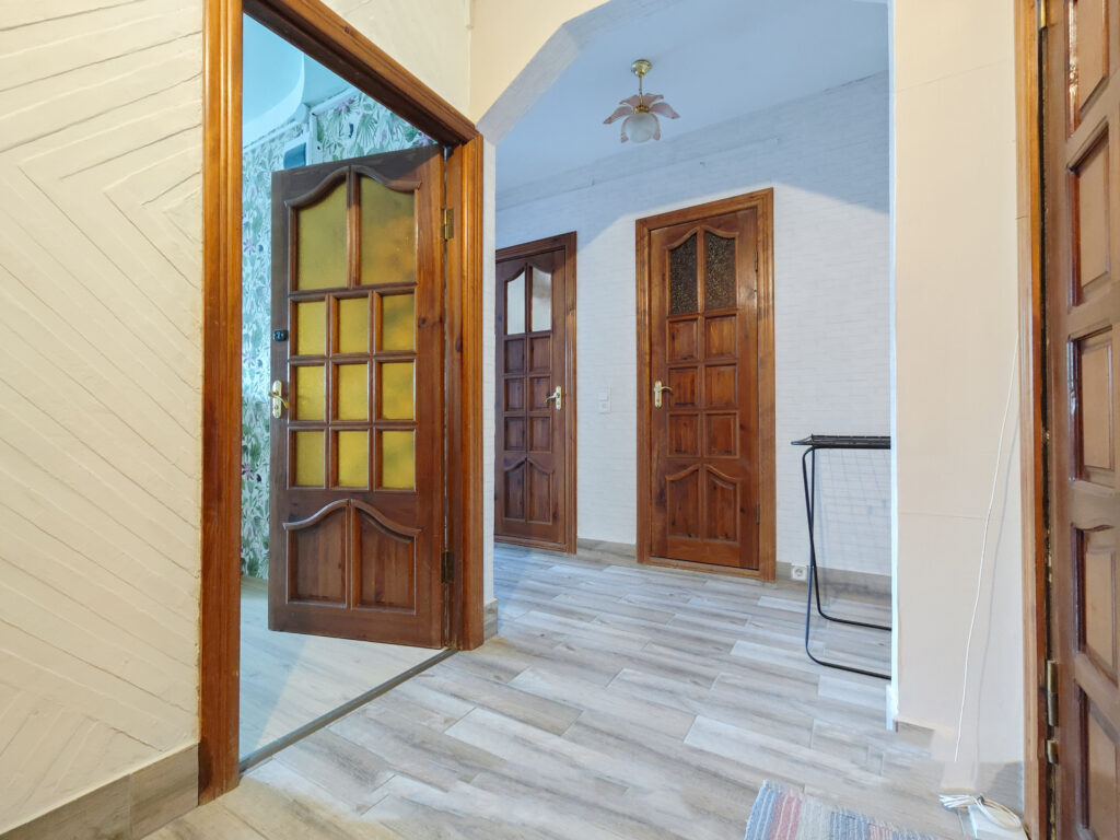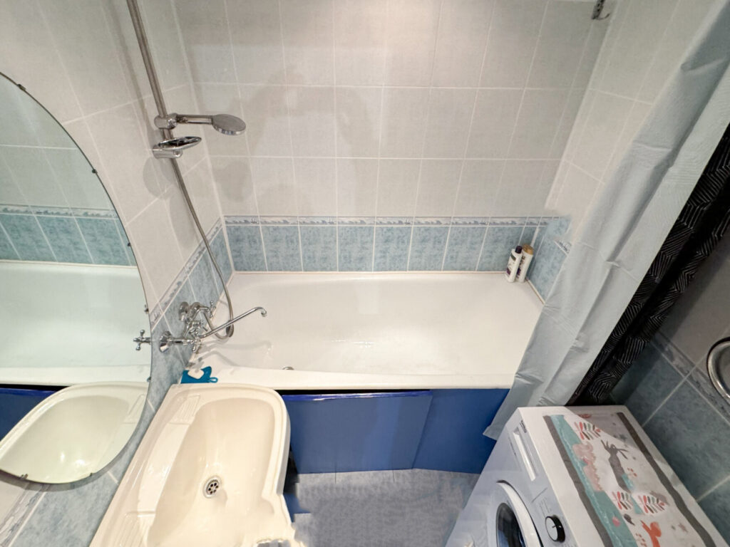 Санузел разделенн на ванную и туалет. В ванной комнате есть стиральная машина, а в коридоре — сушилка для белья.