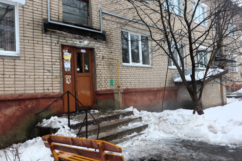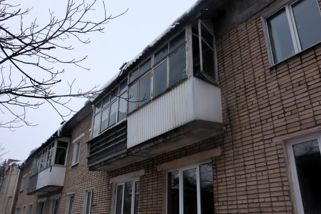 Мастер коммунальщиков сказал Елизавете и журналисту, что козырьки двух подъездов укреплены. Новый козырёк первого подъезда установят в этот же день, а козырьки второго и третьего подъездов заменят весной.