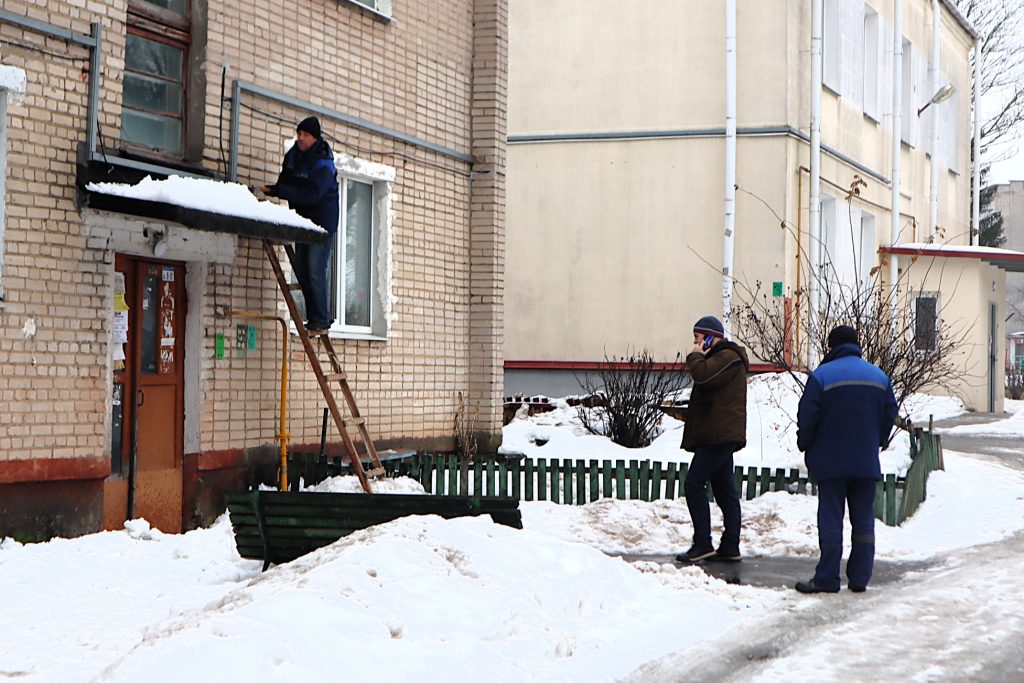 По словам Елизаветы, затем двое рабочих под руководством мастера отбивали лёд и убирали снег с козырьков двух других подъездов. Журналист Kraj.by был на месте в 09:55. В это время рабочий чистил козырёк третьего подъезда. Было заметно, что этот козырёк наклонен.