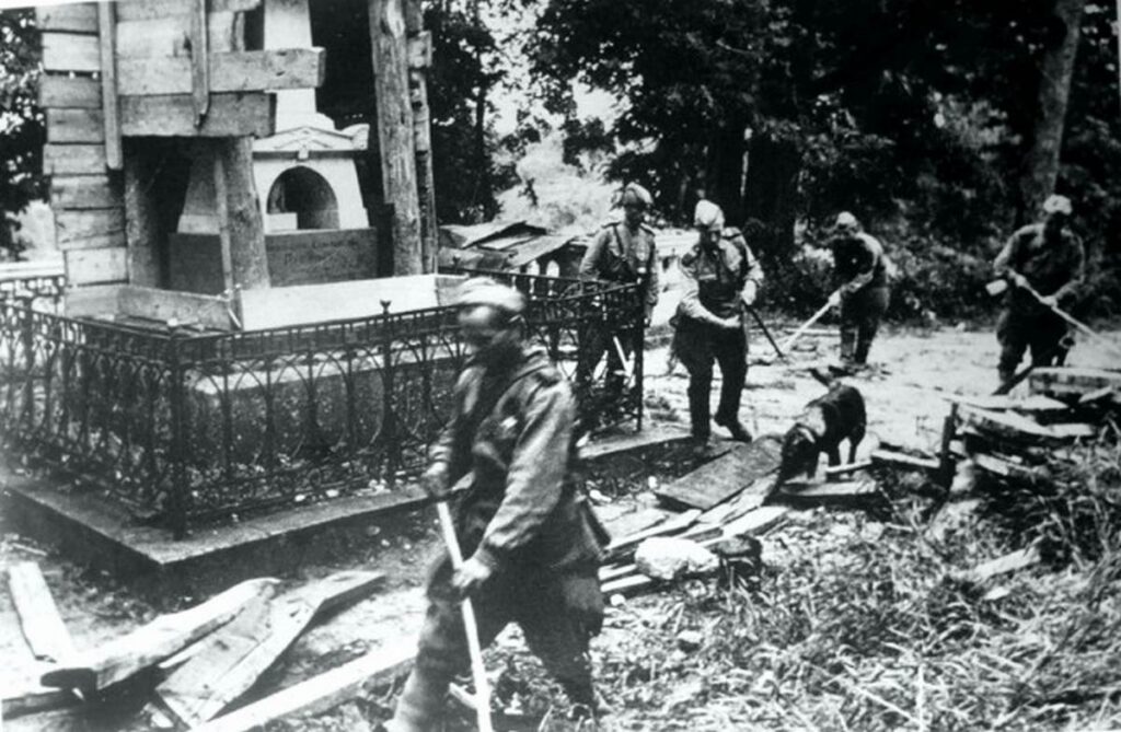 Вечером 13.06.1944 года при обезвреживании мин, найденных в монастыре и в его округе, от взрыва мины с зарядом необезвреживаемого типа погибли девять человек и многие красноармейцы получили тяжелые ранения. Погибшие бойцы и офицеры были захоронены в братской могиле у стен Святогорского монастыря».