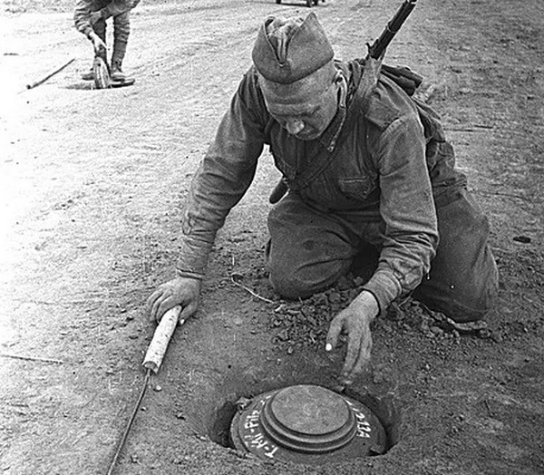 И вот идем по дороге со щупами, это длинная палка с металлическим наконечником, тыкаем в землю, в бугорки. Звякает металл о металл… Противотанковая мина не взрывается, для этого нужно давление на нее тяжести. Потом счищаешь землю, отвинчиваешь крышку, под ней — взрыватель. Взрыватель кладешь в карман для отчета. Корпус мины берешь за ручку и отбрасываешь в кювет. Всю дорогу проверили. Принес я тогда нашему лейтенанту взрывателей 48 штук…»