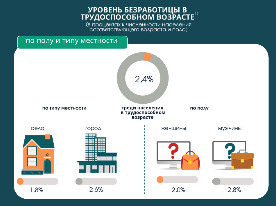 Это исключительно низкий показатель по международным меркам, который говорит о высокой степени вовлеченности населения в экономические процессы. Количество не занятых в экономике граждан в трудоспособном возрасте и вовсе составляет лишь 2,6%. Примечательно, что и здесь различия между городом и селом практически отсутствуют — 2,7% и 2,6%.