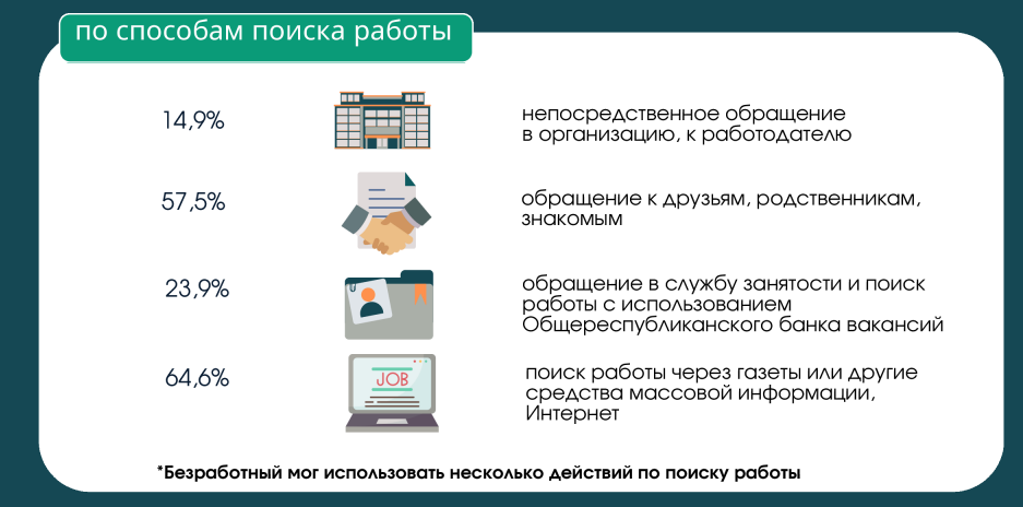 При этом государственные институты не остаются в стороне. Каждый четвертый (23,9%) воспользовался услугами службы занятости или Общереспубликанского банка вакансий. Это говорит о том, что официальные каналы остаются востребованными и играют значительную роль в регулировании рынка труда.