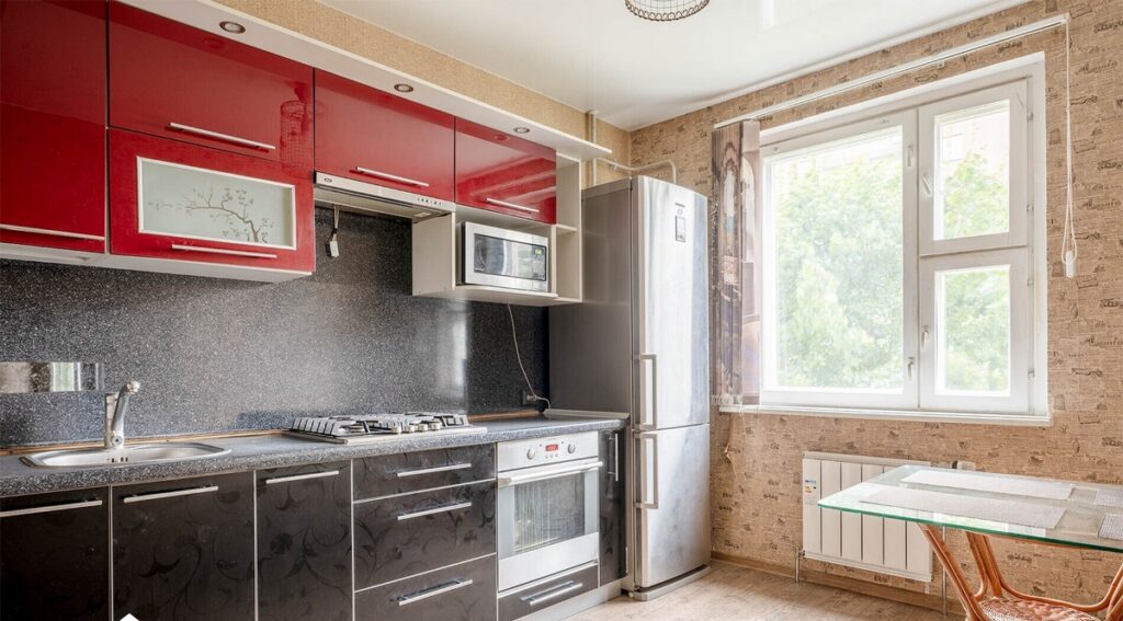 Кухня в квартире занимает 10,8 квадратных метра. Комнаты выходят на разные стороны дома, что обеспечивает хорошую освещенность.