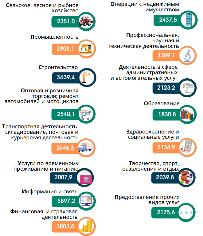 На втором месте с заметным отставанием, но все же с высоким результатом, находится финансовая и страховая деятельность — 3803,5 рублей. Управление денежными потоками, кредитование, инвестиции — этот фундамент экономики всегда был и остается высокооплачиваемым. Третью ступень пьедестала занимает строительство с 3639,4 рублями. Активное развитие инфраструктуры, жилищное строительство и реализация крупных государственных проектов обеспечивают стабильный спрос на профессии этой отрасли.