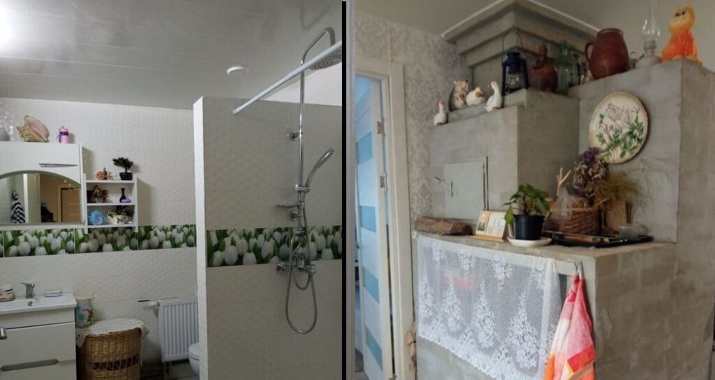 Общая площадь этого дома составляет почти 59 квадратных метров. Планировка дома продумана: здесь имеется большая веранда, прихожая, три жилые комнаты, кухня с печью-плитой и отдельный санузел. Внутренние пространства дома выполнены с учетом современных требований: стены выровнены и оклеены обоями, потолки оформлены натяжными покрытиями, а на полах уложены плитка и паркет.