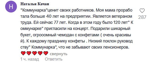 Другие пользователи рассказали о внимании предприятия не только к нынешним, но и к бывшим сотрудникам. Одна из дочерей ветерана труда поделилась, что ее мать, проработавшая на «Коммунарке» более 40 лет, до сих пор получает подарки к праздникам и была приглашена на юбилей предприятия.
