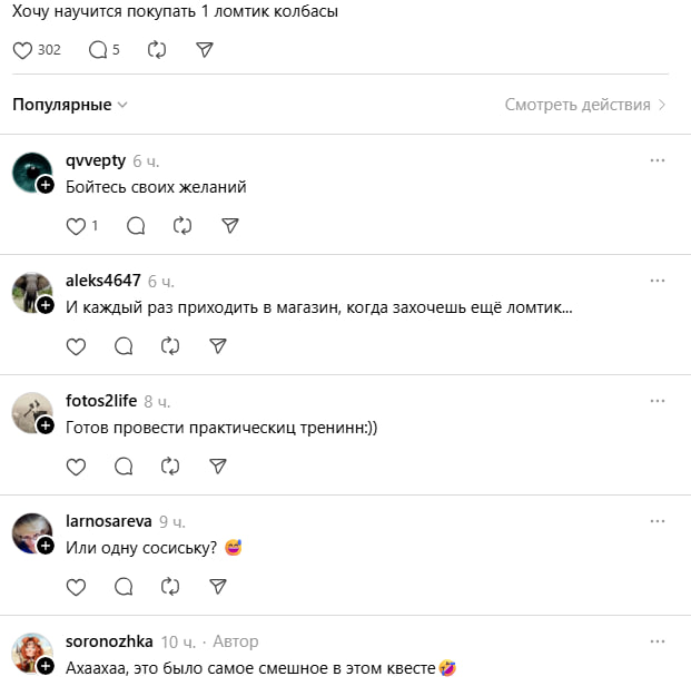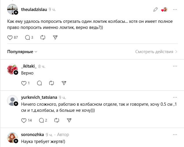Отдельное внимание комментаторы уделили покупке колбасы. Автор рассказала, что сын специально попросил в магазине отрезать всего один ломтик — и, как выяснилось, это вполне обычная практика. В обсуждении даже появились советы от работников торговли, как правильно заказывать «0,5–1 сантиметр» продукта.