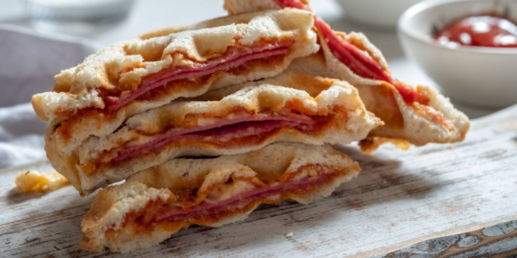 Третий рецепт разрушает стереотип о том, что вафли — это обязательно сладко. Тонкое дрожжевое тесто выступает здесь идеальной основой для итальянской начинки. Это удобный формат для завтрака или быстрого ужина: хрустящие края, тягучий сыр и томатный соус.