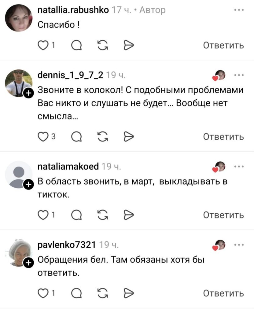 Мы попробовали связаться с автором поста, но были проигнорированы. Не исключено, что человек на работе или очень занят. Тем не менее, нашлись те, кто готов женщину поддержать. «Звоните в колокол. С подобными проблемами Вас никто и слушать не будет… Вообще нет смысла», — написал один из пользователей Threads. Как же? Ее не только дважды услышали, но и уверили, что ситуация на контроле и уже решается. Как говорится: кто ищет тот всегда найдет.