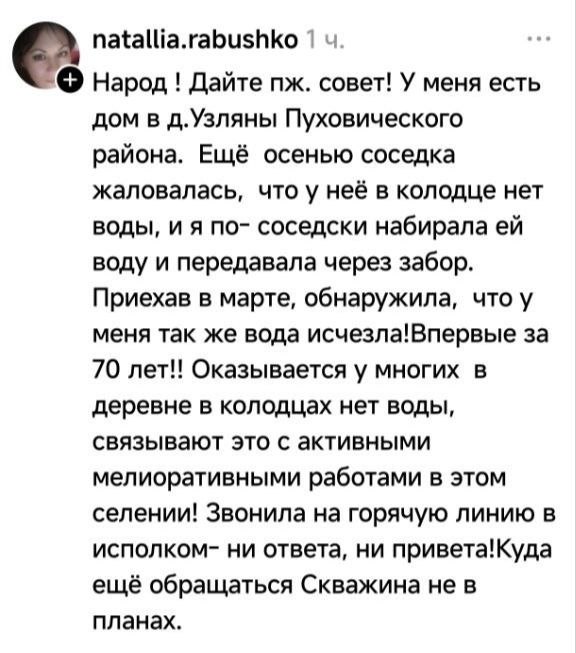 Уже сутки на просторах Threads висит крик души. Если вкратце и по сути, то у белоруски пересох колодец. Осенью 2025 года ее соседка боролась с такой же бедой. А этой весной сама героиня поста столкнулась с отсутствием воды. С ее слов подобное случилось впервые за 70 лет. Гражданка даже провела собственное небольшое расследование, которое дало понять, что воды нет у многих в деревне. Местные жители выдвинули теорию: якобы в селении идут активные мелиоративные работы, которые и опустошили колодцы.