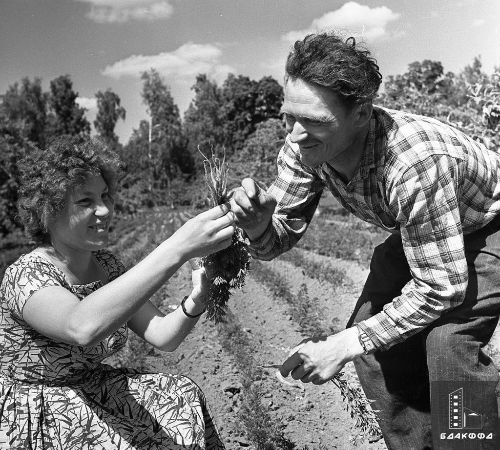 Фото: из архива БГАКФФД. 2. Доярка колхоза «Ударник» Старобинского района тогдашней Минской области А. Липская и учетчик, студент-заочник М. Зенович Белорусской сельскохозяйственной академии, на поле четвертой бригады, 21 мая 1958 г.