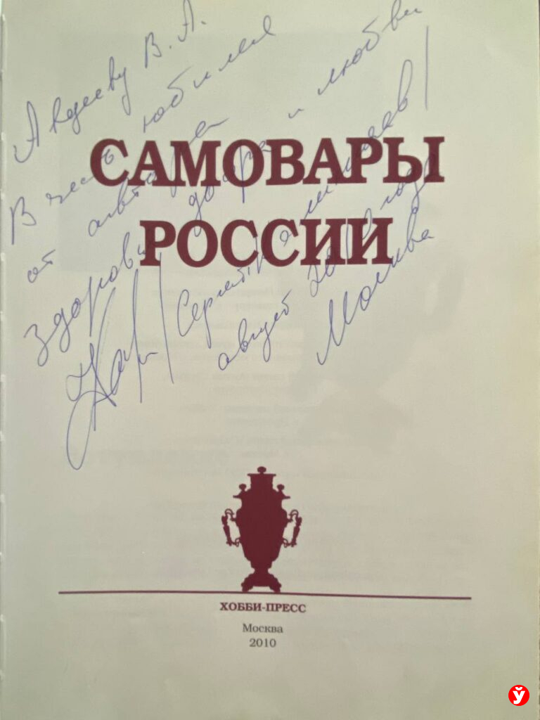 Эти предметы старины глубокой реставратор изучает по редкой книге «Самовары России» Сергея Калиничева. Неожиданно на свое 60-летие он обнаружил на первой странице издания автограф. Сюрприз преподнесли родные. Незаметно взяли книгу, съездили в Москву к автору и подписали.