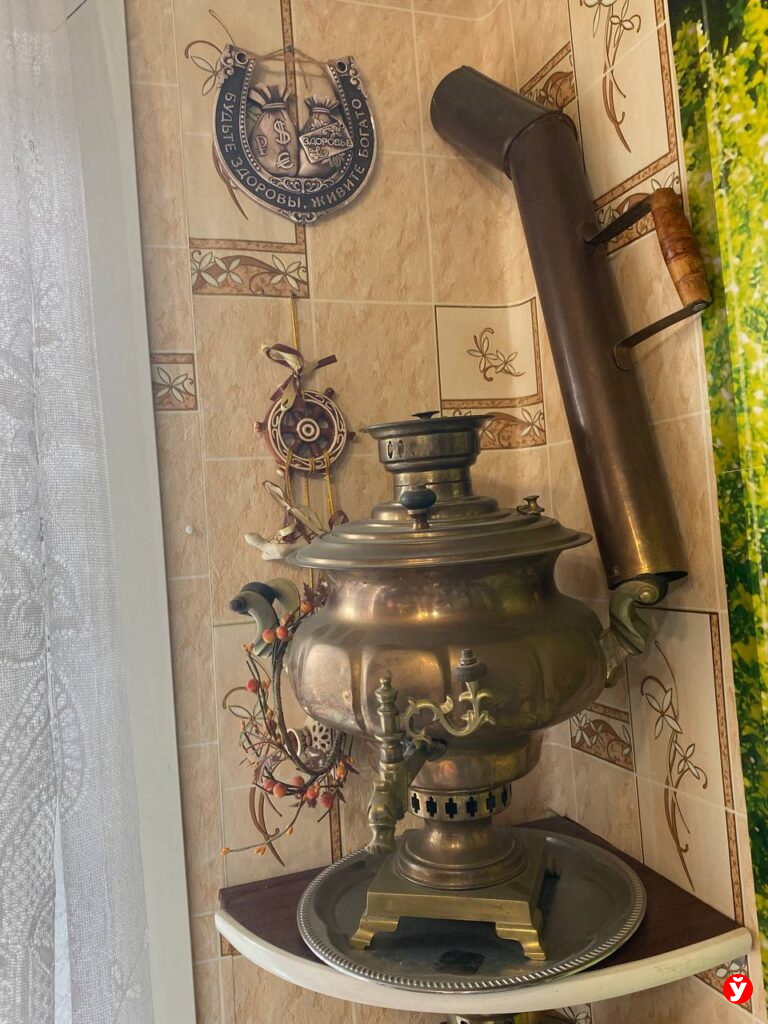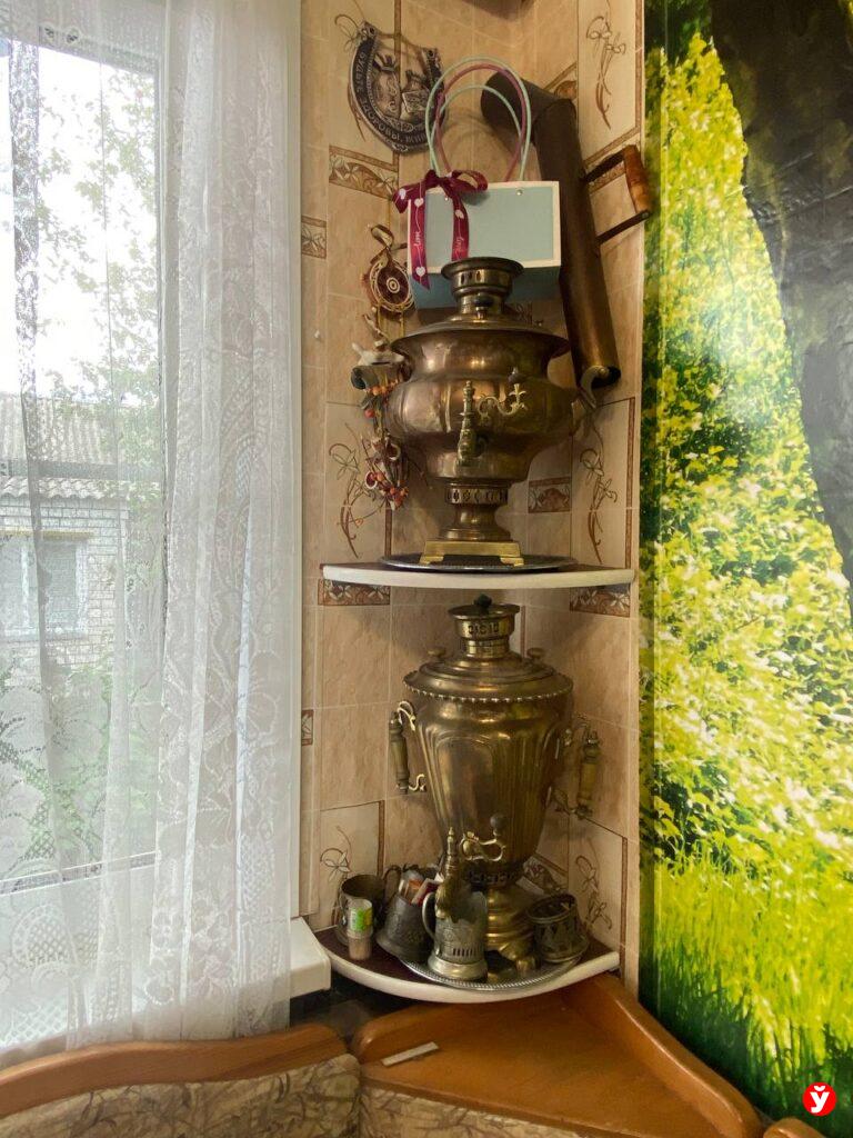На кухонную полку затесался фарфоровый самовар, пара образцов советской эпохи и даже сувенирный из металла — умещается на ладони.